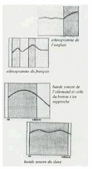 Selon Tomatis toujours, une langue est influencée par le milieu naturel et reste une musique. Cette bretonnante âgée, de Plouvien, l'avait bien senti, lorsqu'elle a dit, un jour: "Je ne comprends pas ce qu'ils (les enfants des classes bretonnes) disent: ils n'ont pas la musique de ma langue." La musique de ma langue! Une musique différente selon les langues. Le français est une langue pauvre en sons et utilise les sons graves alors que l'anglais est sensible aux aigus. Les Slaves ont un spectre sonore très large et parlent facilement trois ou quatre langues. Sur la courbe allemande, on relève une affinité pour les sons graves et la bande s'étale jusqu'à 3 000 Hz. L'ethnogramme du breton s'en rapproche. Ce qui explique que les prisonniers brteons de la deuxième guerre mondiale ont appris facilement cette langue. |